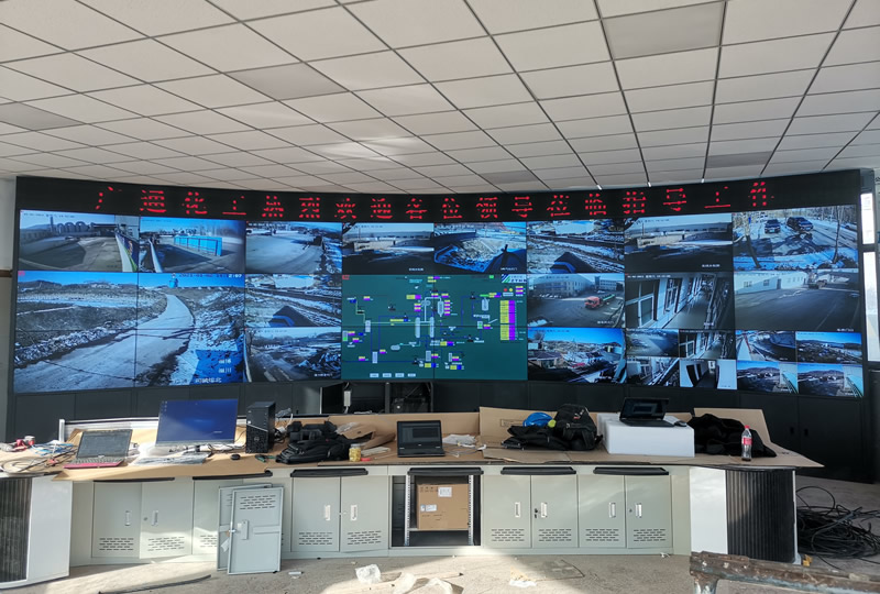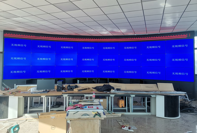 本案例中,維康國際為中騰環(huán)保提供一套指揮中心大屏,主要由3X8拼接、55寸3.5mm液晶拼接屏組成,大屏幕顯示清晰亮麗,雙邊拼縫較小,采用機(jī)柜式弧形安裝,更顯高檔大氣,如上圖所示,主要 用來顯示監(jiān)控畫面及指揮調(diào)度。