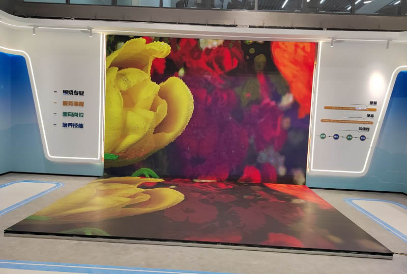 本案例中,維康國(guó)際為青島市某企業(yè)展廳提供一套L型LED顯示屏,如上圖所示,地面與墻面形成90度角,大屏幕顯示清晰,3D圖像顯示效果更好。