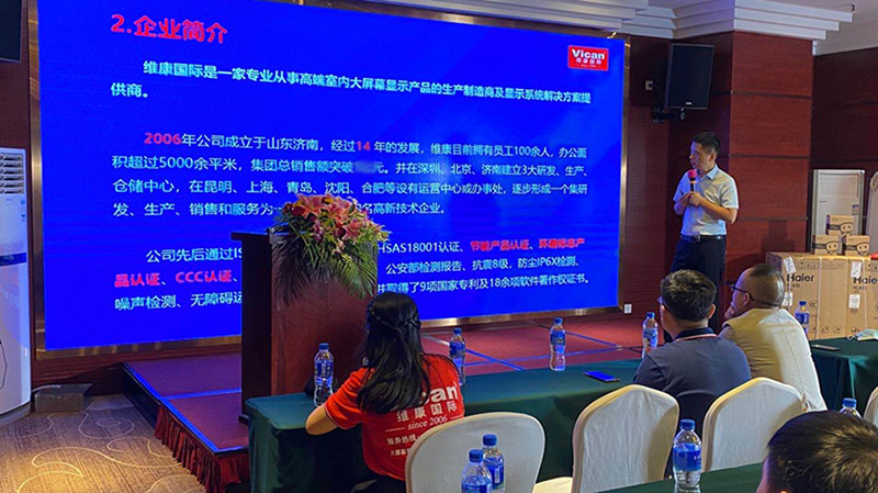 會(huì)議開始,索特公司許總對(duì)本次發(fā)布會(huì)到場(chǎng)的嘉賓及廣大朋友致以熱烈的歡迎,維康國(guó)際集團(tuán)總裁曹有軍先生與大家一起回顧了維康國(guó)際的成長(zhǎng)之路,并對(duì)維康國(guó)際的公司實(shí)力、未來(lái)的發(fā)展進(jìn)行了詳細(xì)的介紹,并表明維康國(guó)際將進(jìn)一步拓展在拼接屏、商顯等大屏顯示行業(yè)中的版圖,以更完善的服務(wù),提高品牌的知名度,讓更多的客戶認(rèn)可接受我們的產(chǎn)品,相信通過(guò)與廣大合作伙伴的共同攜手前行,必將在大屏市場(chǎng)上再創(chuàng)佳績(jī),共贏未來(lái)。