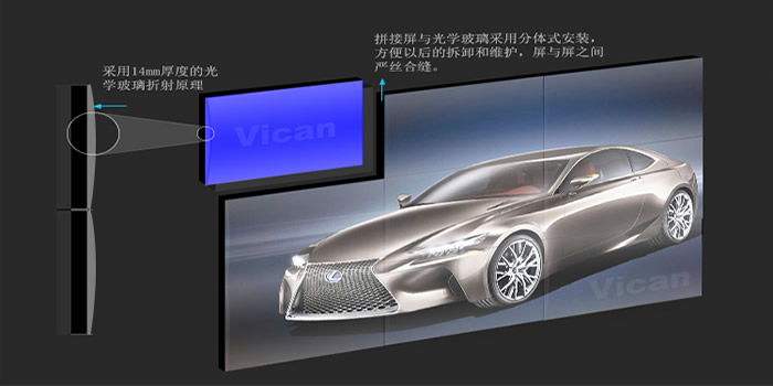 1、第三代無縫液晶拼接墻的技術(shù)原理是采用BFT技術(shù)和高分子的透明玻璃與原有的液晶拼接屏進(jìn)行封裝,通過光的折射原理實(shí)現(xiàn)0mm拼縫顯示。