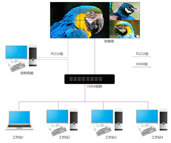 2、傳輸2K高清信號源,支持多臺電腦信號同時(shí)上大屏顯示,而且可實(shí)現(xiàn)任意切換顯示功能。