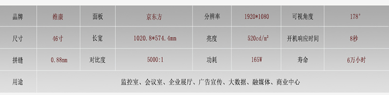 46寸拼接屏0.88mm拼縫的產(chǎn)品采用國(guó)產(chǎn)京東方面板組成,是目前除55寸以外另外一款可以做到0.88mm拼縫的產(chǎn)品,目前也只有京東方一款面板可選。