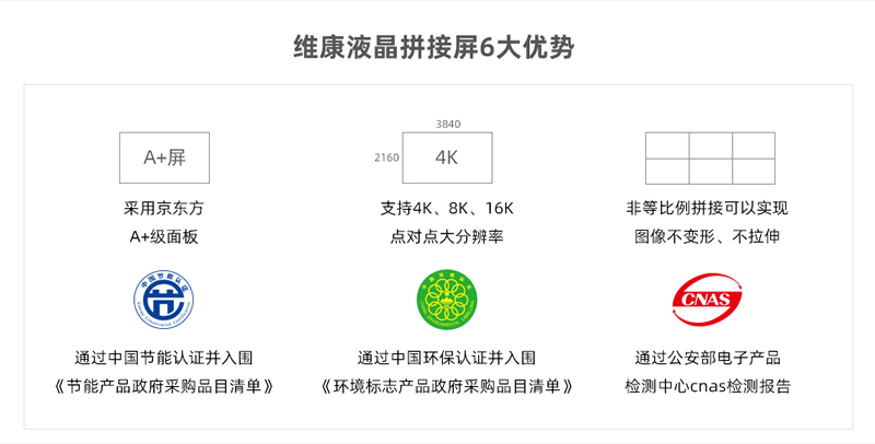 46寸拼接屏0.88mm產(chǎn)品經(jīng)過(guò)了CQC中國(guó)質(zhì)量認(rèn)證中心檢測(cè),取得了環(huán)保、節(jié)能認(rèn)證,CNAS檢測(cè)報(bào)告等認(rèn)證,產(chǎn)品質(zhì)量穩(wěn)定可靠。