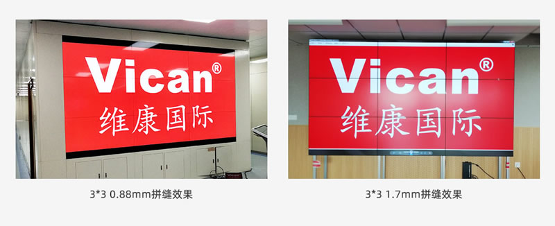下圖是一組3*3的46寸拼接屏0.88mm與1.7mm液晶拼接屏的對(duì)比效果,二者大的區(qū)別就是拼縫上面,0.88mm的拼縫明顯更小,視覺(jué)效果更好。