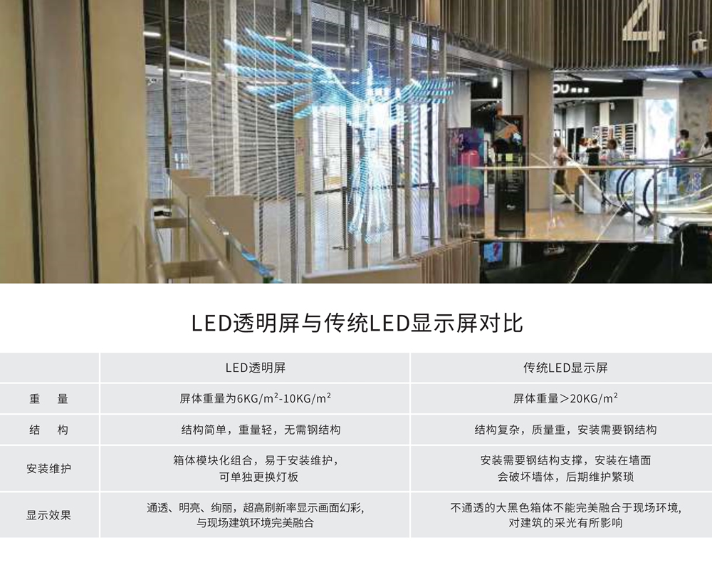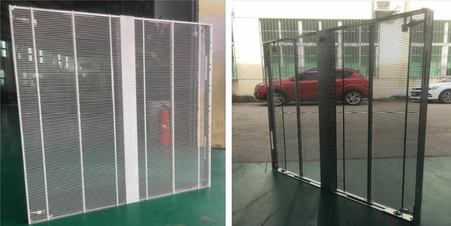 LED透明屏采用鏤空條狀設(shè)計(jì),相對(duì)與傳統(tǒng)LED顯示屏箱體,其結(jié)構(gòu)更加靈活,重星更輕。