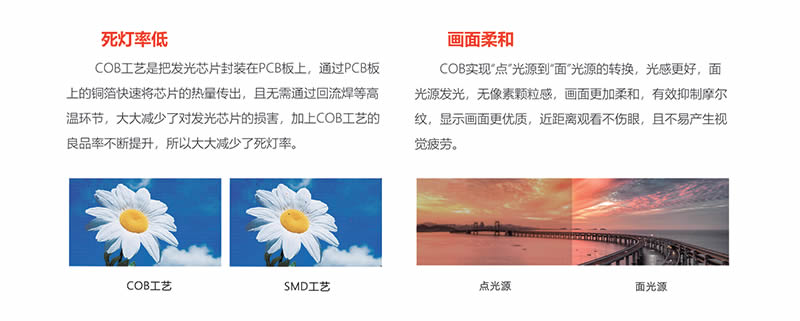 COB采用平面封裝,表面進(jìn)行了特殊處理,有效減輕摩爾紋的產(chǎn)生。