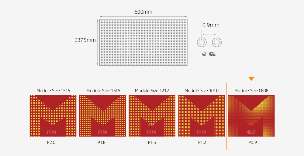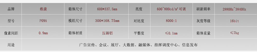 箱體尺寸為600*337.5mm,模組尺寸300*168.75mm,像素間距0.9mm,箱體重量小于6kg,亮度600~800可調(diào),灰度等級16bit,刷新率2880Hz~3840Hz,前維護(hù)安裝,8級防震,LED燈壽命大于10萬小時。