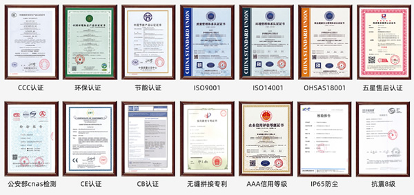 ISO9001、ISO14001、OHSAS18001、3C、節(jié)能認(rèn)證、環(huán)保認(rèn)證、檢測報(bào)告、防塵、CE、CB、FCC、ROHS、外觀專利、大屏軟件專利等。